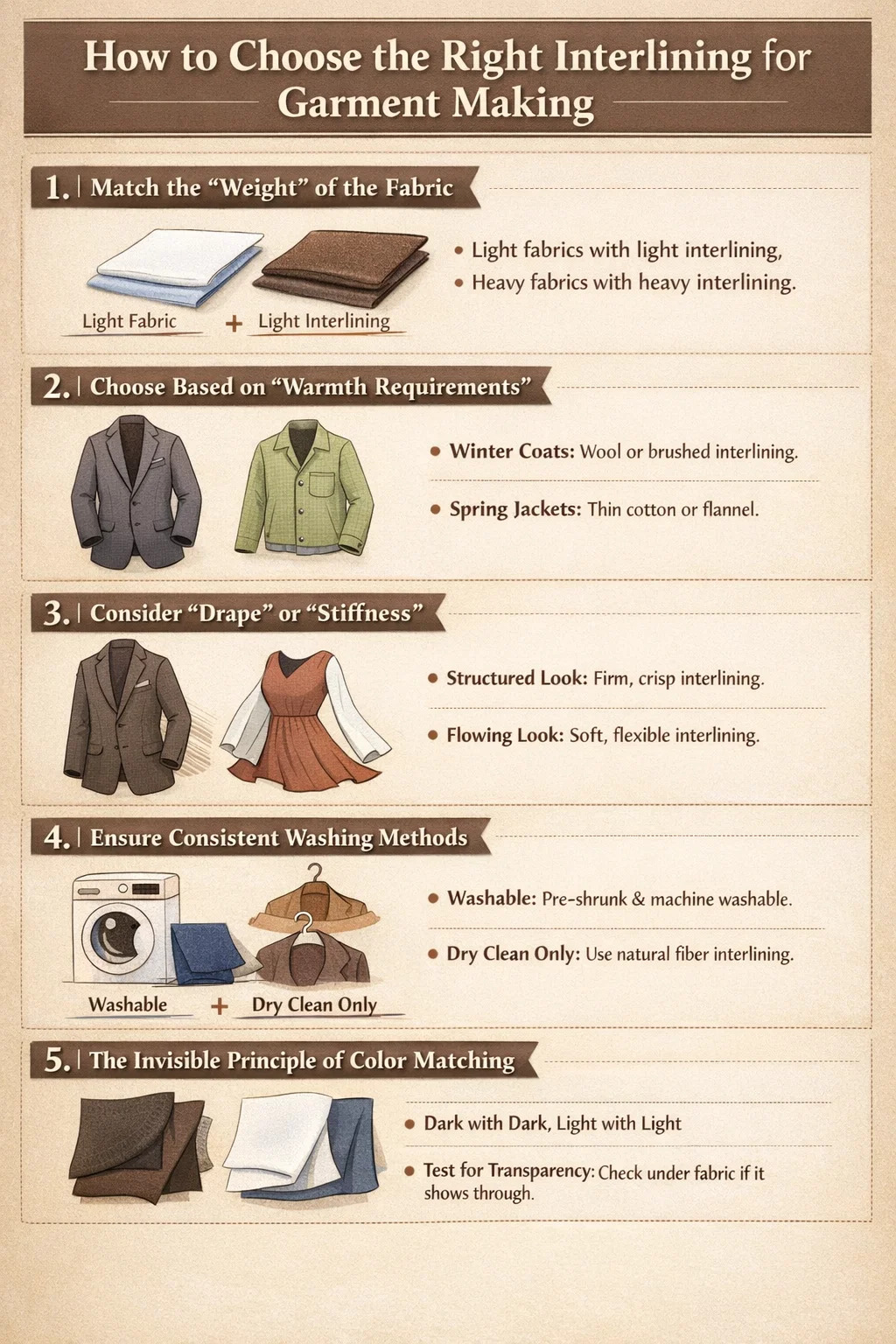এটি সবচেয়ে মৌলিক নীতি: হালকা ইন্টারলাইনিং সহ হালকা কাপড় এবং ভারী ইন্টারলাইনিং সহ ভারী কাপড়।