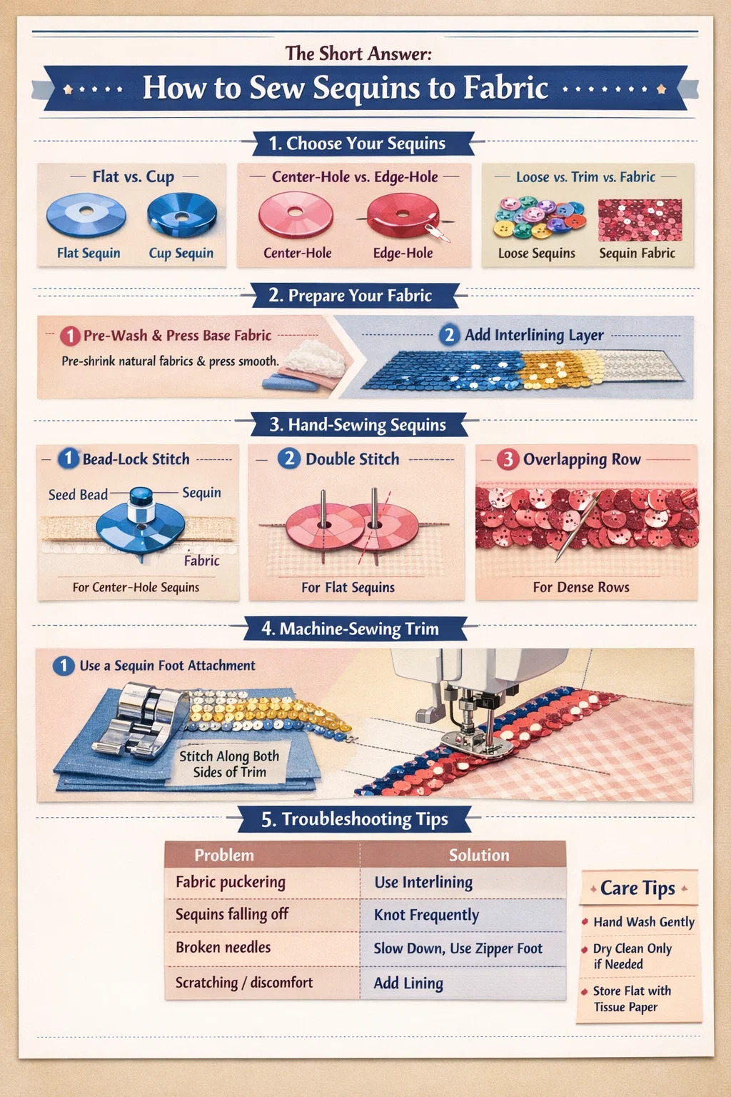 এই নির্দেশিকাটি প্রতিটি পর্যায়ে চলে: সঠিক সিকুইন বেছে নেওয়া, আপনার কাপড় প্রস্তুত করা এবং ইন্টারলাইন করা, স্বতন্ত্র টুকরো হাতে সেলাই করা, মেশিন দ্বারা সিকুইন ট্রিম প্রয়োগ করা, সাধারণ সমস্যার সমাধান করা এবং আপনার সমাপ্ত প্রকল্পের যত্ন নেওয়া। নির্দিষ্ট সেলাই গণনা, থ্রেডের ধরন, এবং ইন্টারলাইনিং ওজন অন্তর্ভুক্ত করা হয়েছে যাতে আপনি এমন ফলাফল পেতে পারেন যা ঘরে তৈরির চেয়ে পেশাদার দেখায়।