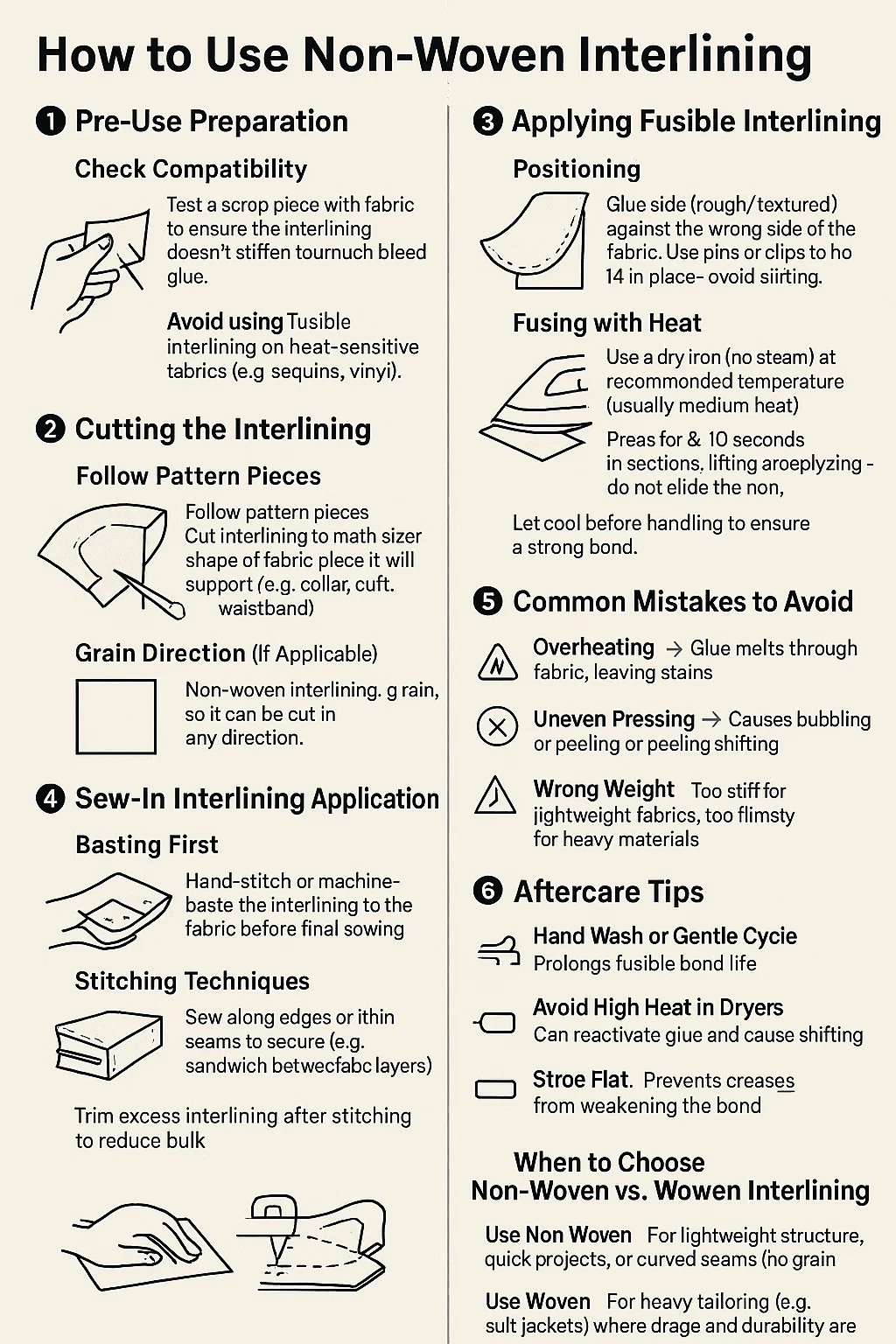 তাপ-সংবেদনশীল কাপড়গুলিতে (যেমন, সিকুইনস, ভিনাইল) ফিউজিবল ইন্টারলাইনিং ব্যবহার করা এড়িয়ে চলুন।