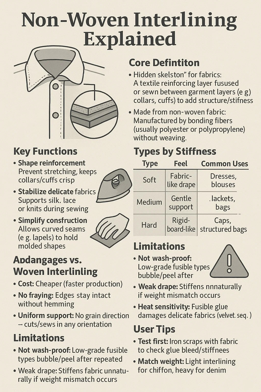 কাপড়ের জন্য "লুকানো কঙ্কাল": কাঠামো/কঠোরতা যুক্ত করতে পোশাক স্তরগুলির (যেমন, কলারস, কাফস) এর মধ্যে একটি টেক্সটাইল রিইনফোর্সিং লেয়ার ফিউজড বা সেলাই করা হয়।