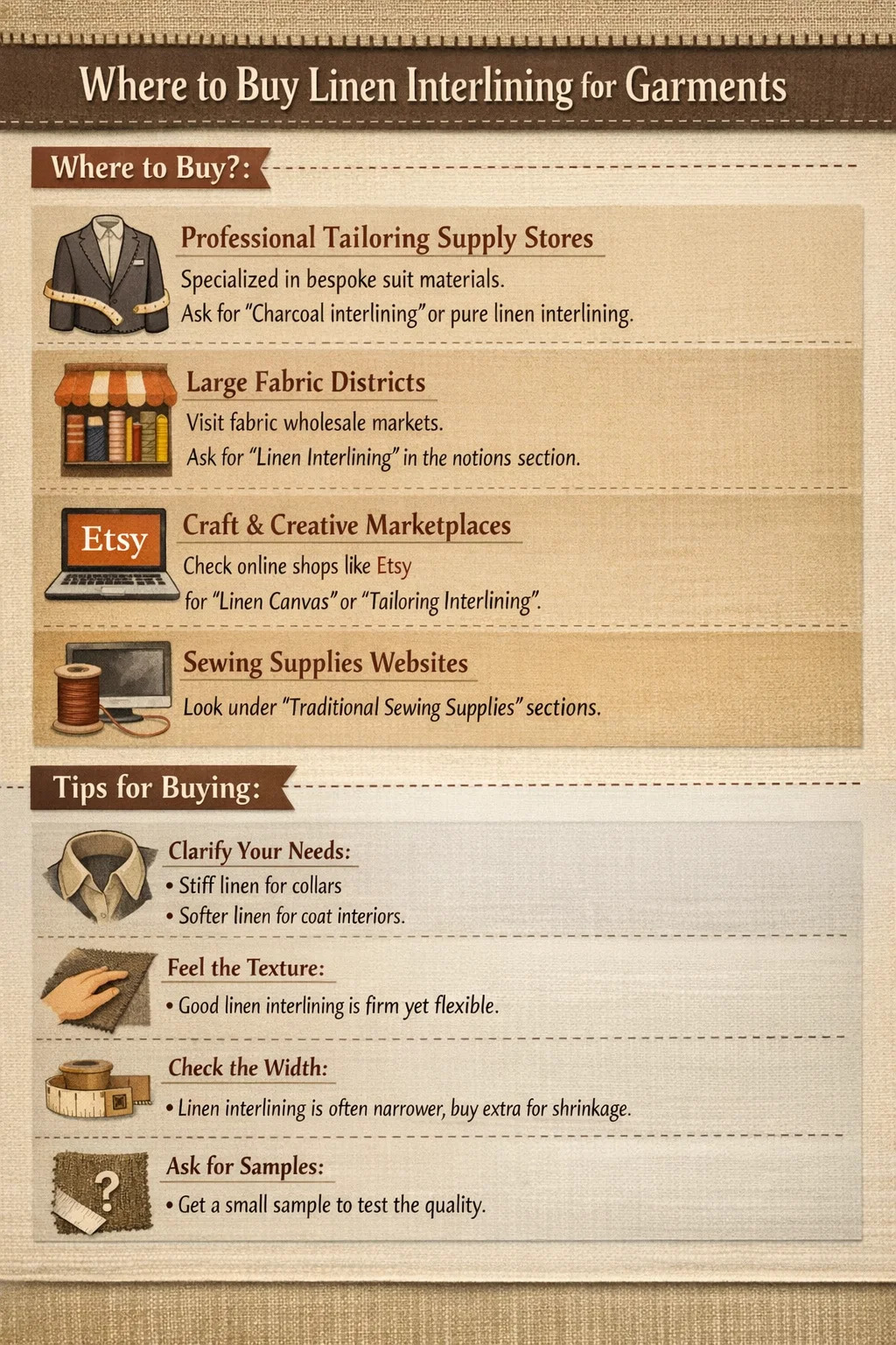সেলাই উত্সাহীদের জন্য নিবেদিত কিছু ওয়েবসাইট খুব বিশদ বিভাগ অফার করে। "ঐতিহ্যগত সেলাই সরবরাহ" বিক্রি করে এমন বিভাগগুলি সন্ধান করুন কারণ আধুনিক দ্রুত ফ্যাশন প্রায়শই প্লাস্টিকের ফুসিবল ইন্টারলাইনিং ব্যবহার করে, যখন উচ্চ-মানের হস্তনির্মিত পোশাকগুলি লিনেন ইন্টারলাইনিং ব্যবহার করে।