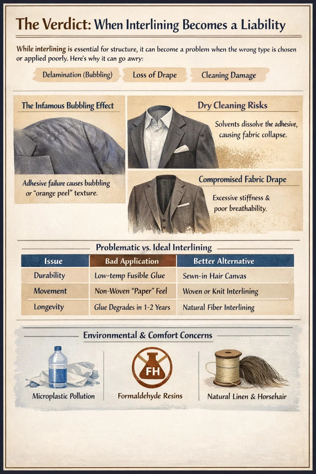 পরিষ্কার হতে, ইন্টারলাইনিং সহজাতভাবে খারাপ নয় ; আসলে, এটি গঠনের জন্য অপরিহার্য। যাইহোক, এটি "খারাপ" হয়ে যায় যখন ভুল টাইপ বেছে নেওয়া হয় বা যখন এটি খারাপভাবে প্রয়োগ করা হয়। একটি নির্দিষ্ট ইন্টারলাইনিং একটি পোশাকের জন্য ক্ষতিকর বলে বিবেচিত হতে পারে এমন প্রাথমিক কারণগুলির মধ্যে রয়েছে delamination (বুদবুদ) , ক প্রাকৃতিক চাদরের ক্ষতি , কnd পরিষ্কারের প্রতিকূল প্রতিক্রিয়া . যখন ইন্টারলাইনিং এবং ফেস ফ্যাব্রিকের মধ্যে বন্ধন ব্যর্থ হয়, এটি স্থায়ী নান্দনিক ক্ষতি তৈরি করে যা বিপরীত করা যায় না।